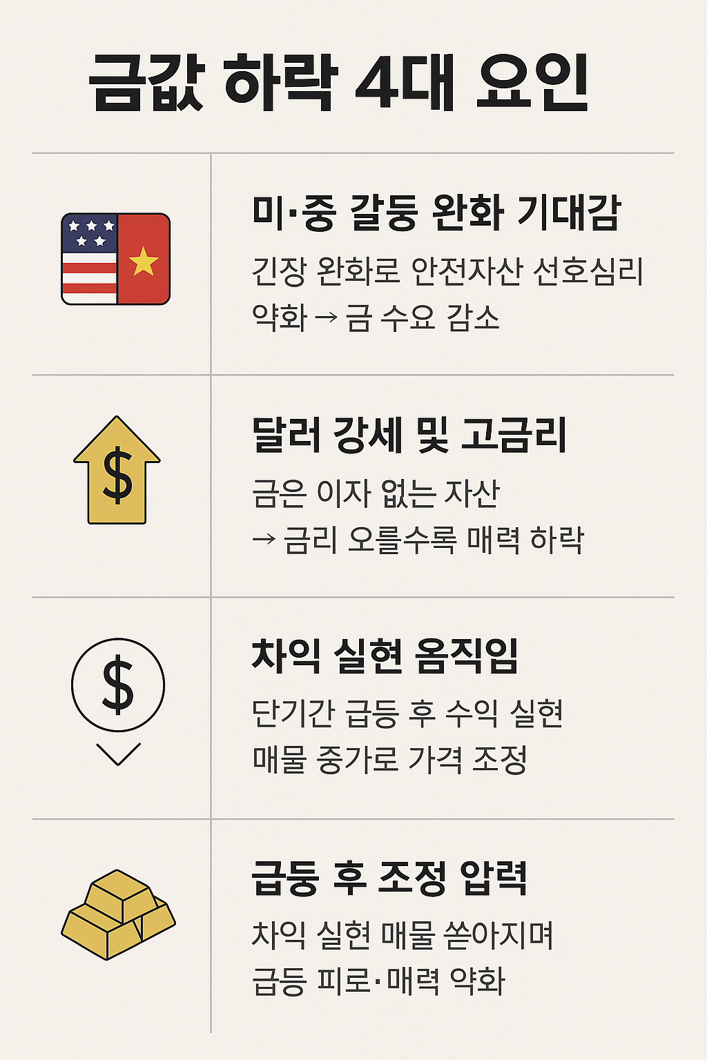 | 달러 강세 및 고금리 | 금은 이자 없는 자산 → 금리 오를수록 매력 하락 |